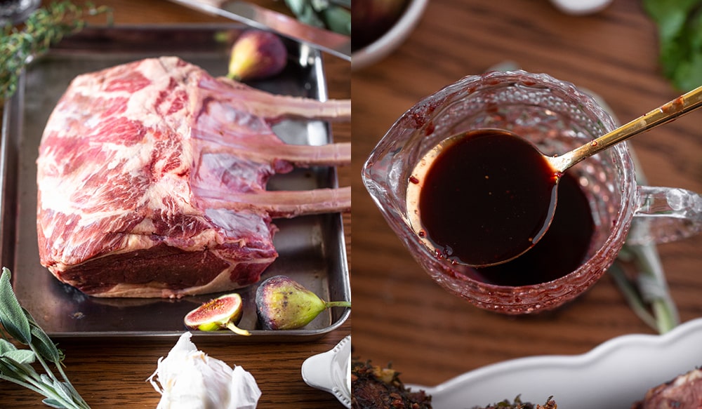 While the Bison French Rack is roasting, prepare the merlot wine fig reduction. In a small pot add the wine, fresh figs, balsamic vinegar, brown sugar, salt, and pepper. Bring to a boil and then reduce the heat to a simmer. Simmer for about 20 minutes until the liquid has reduced by about half. Then remove from the heat and add in the butter.