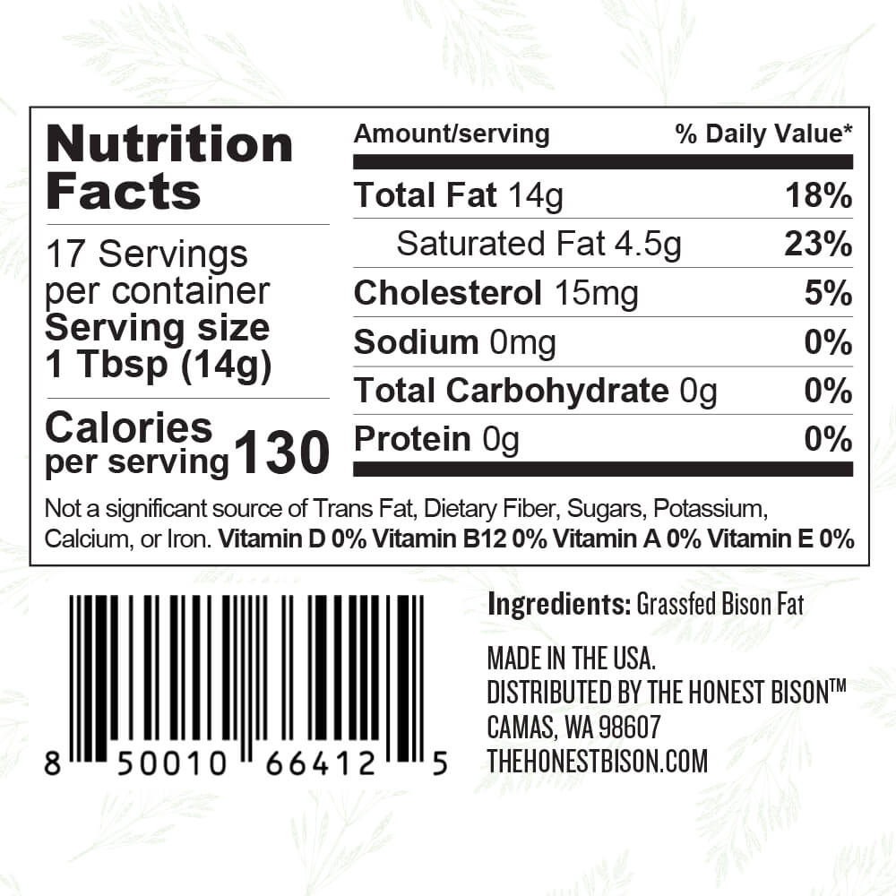 Made in small batches, our 100% Grassfed Bison Tallow is a premium cooking fat with a smooth, rich flavor. Its high smoke point makes it the perfect replacement for lard, butter, oil, and other cooking fats. Use it for baking, roasting, sauteing, and more.